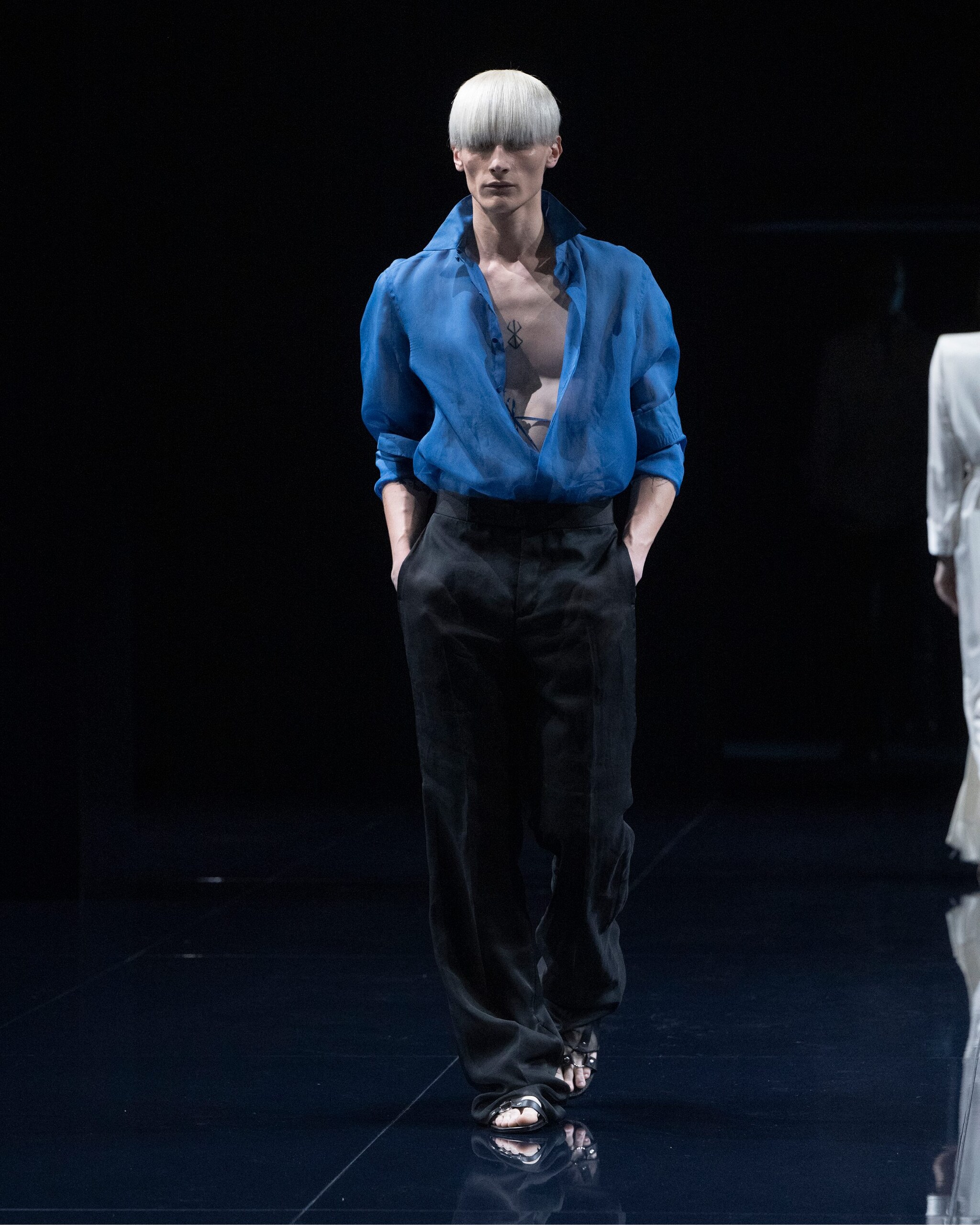 Giacche in suede e completi in pelle colorata, sensuali abiti tunica che aderiscono al corpo senza scoprirlo, slipress e capi in seta e pizzo che ricordano capi intimo o nightwear e ancora sgargianti tocchi di colore acceso sfilano alla Paris Fashion Week sulla passerella Primavera/Estate 2026 di Tom Ford by Haider Hackerman
