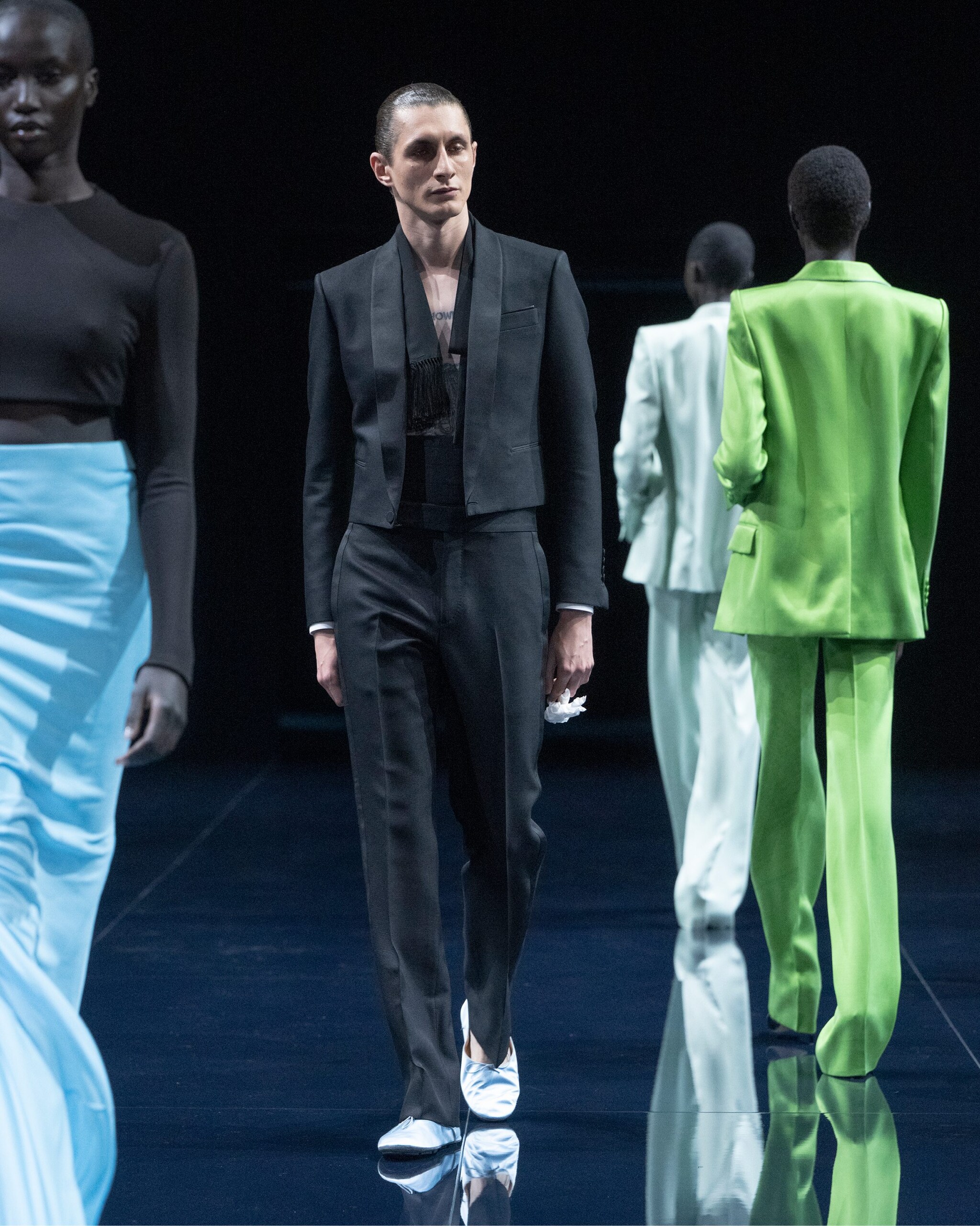 Giacche in suede e completi in pelle colorata, sensuali abiti tunica che aderiscono al corpo senza scoprirlo, slipress e capi in seta e pizzo che ricordano capi intimo o nightwear e ancora sgargianti tocchi di colore acceso sfilano alla Paris Fashion Week sulla passerella Primavera/Estate 2026 di Tom Ford by Haider Hackerman