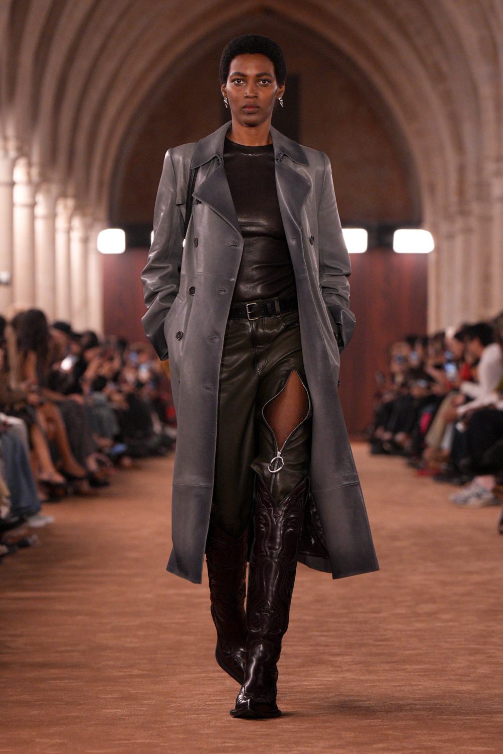 Abiti in pizzo "strappato", denim spalmato, capi tartan e blazer in pelle sfumata sfilano alla Paris Fashion Week sulla passerella Primavera/Estate 2025 di Acne Studios