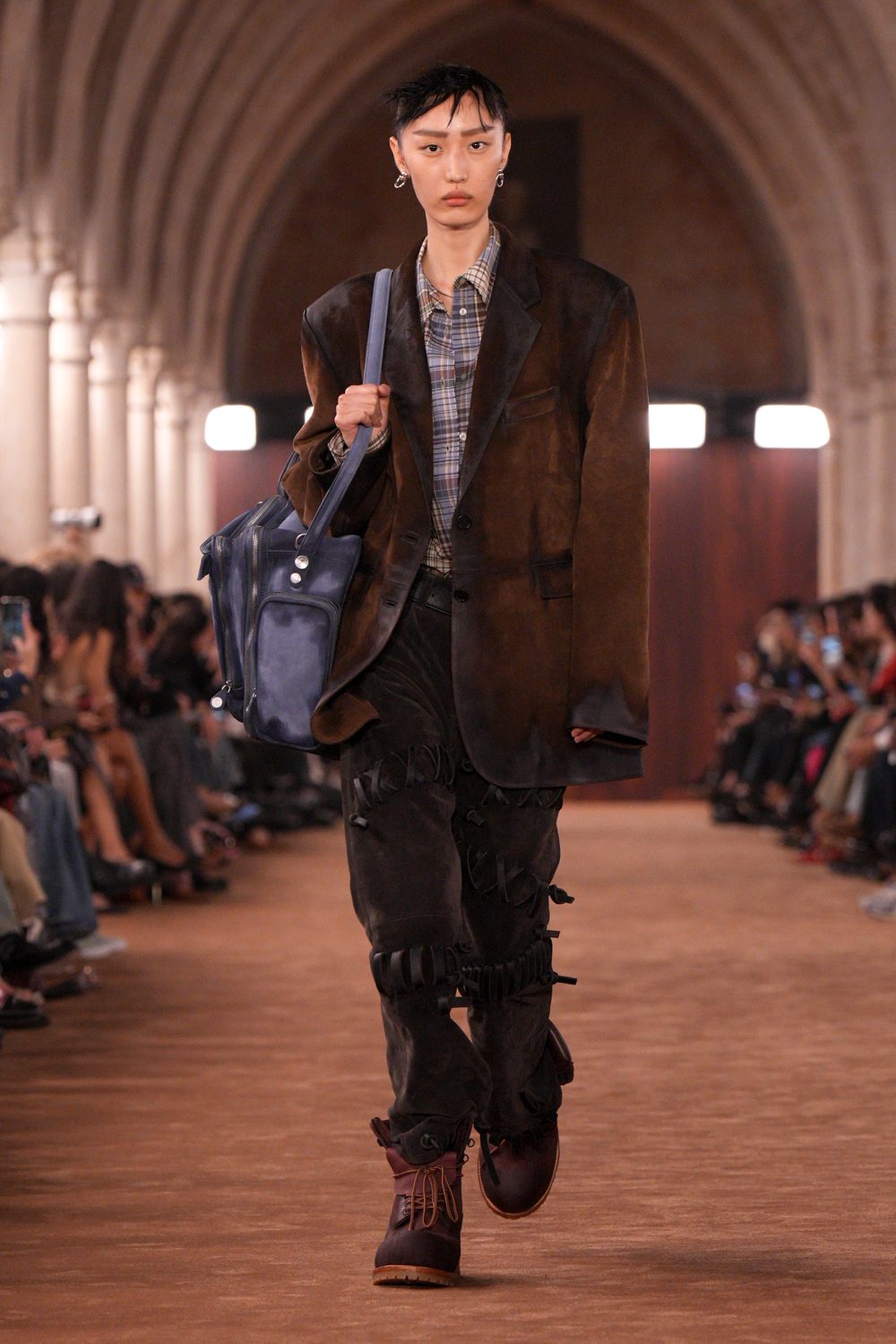 Abiti in pizzo "strappato", denim spalmato, capi tartan e blazer in pelle sfumata sfilano alla Paris Fashion Week sulla passerella Primavera/Estate 2025 di Acne Studios