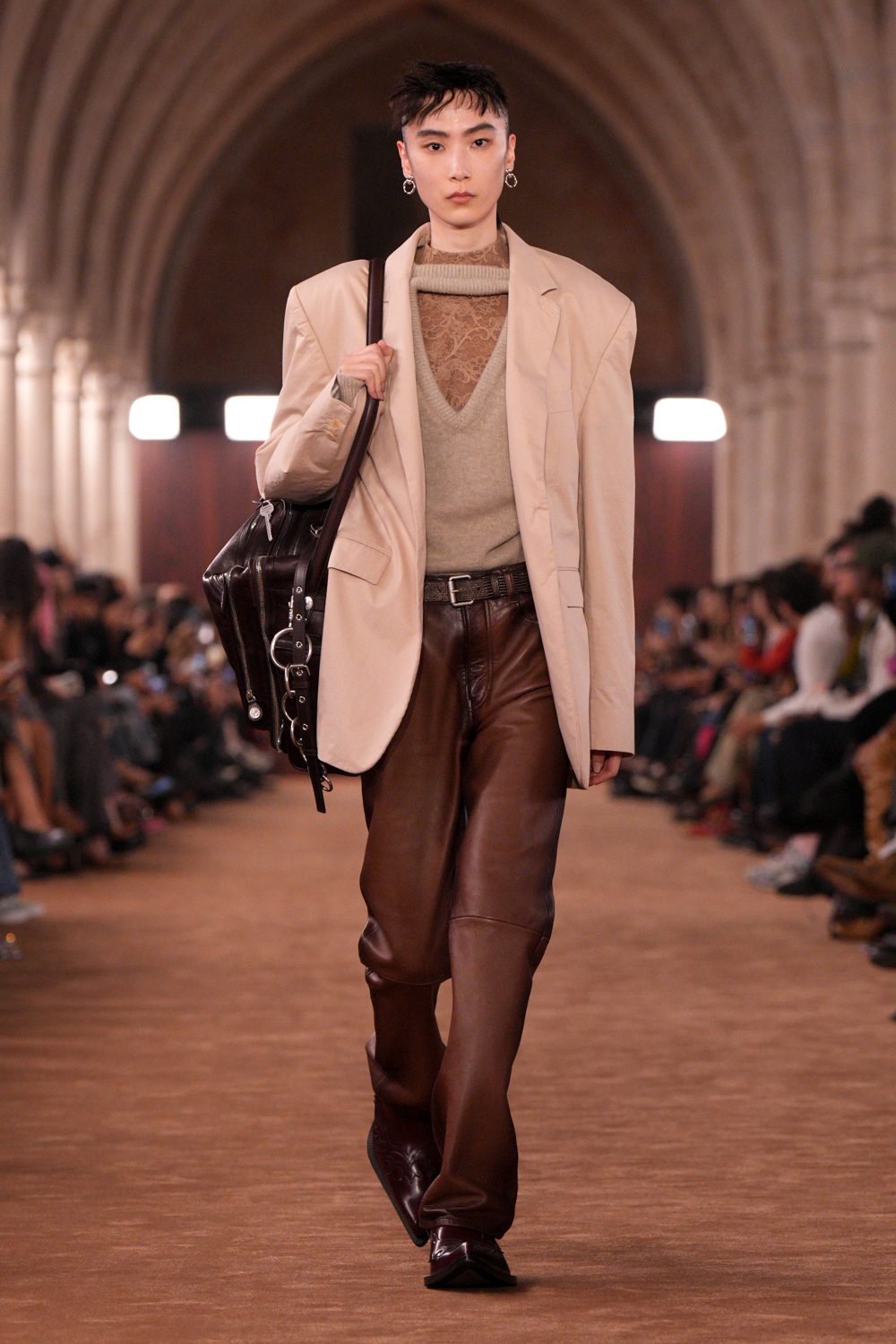 Abiti in pizzo "strappato", denim spalmato, capi tartan e blazer in pelle sfumata sfilano alla Paris Fashion Week sulla passerella Primavera/Estate 2025 di Acne Studios