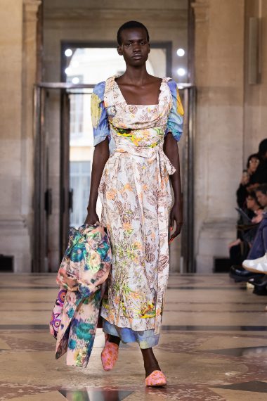 Tartan mescolato con fantasie animalier o floreali e ancora ghirigori stampati su abiti strapless, modelli asimmetrici, drappeggi e completi con blazer oversize sfilano alla Paris Fashion Week sulla passerella Primavera/Estate 2026 di Vivienne Westwood by Andreas Kronthaler