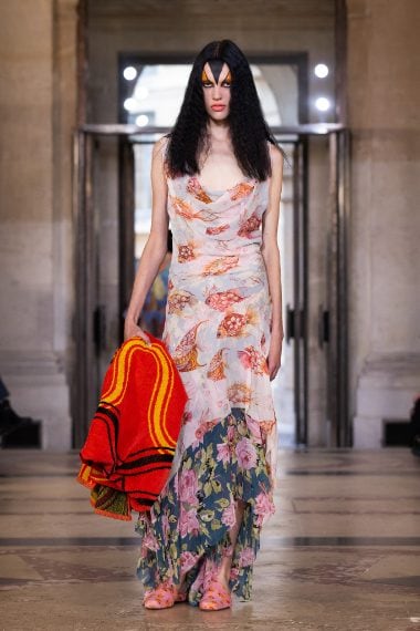 Tartan mescolato con fantasie animalier o floreali e ancora ghirigori stampati su abiti strapless, modelli asimmetrici, drappeggi e completi con blazer oversize sfilano alla Paris Fashion Week sulla passerella Primavera/Estate 2026 di Vivienne Westwood by Andreas Kronthaler