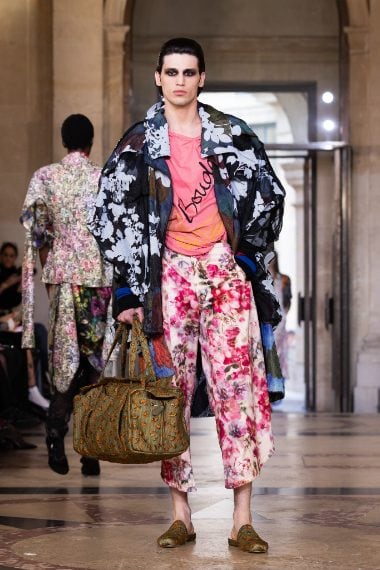 Tartan mescolato con fantasie animalier o floreali e ancora ghirigori stampati su abiti strapless, modelli asimmetrici, drappeggi e completi con blazer oversize sfilano alla Paris Fashion Week sulla passerella Primavera/Estate 2026 di Vivienne Westwood by Andreas Kronthaler