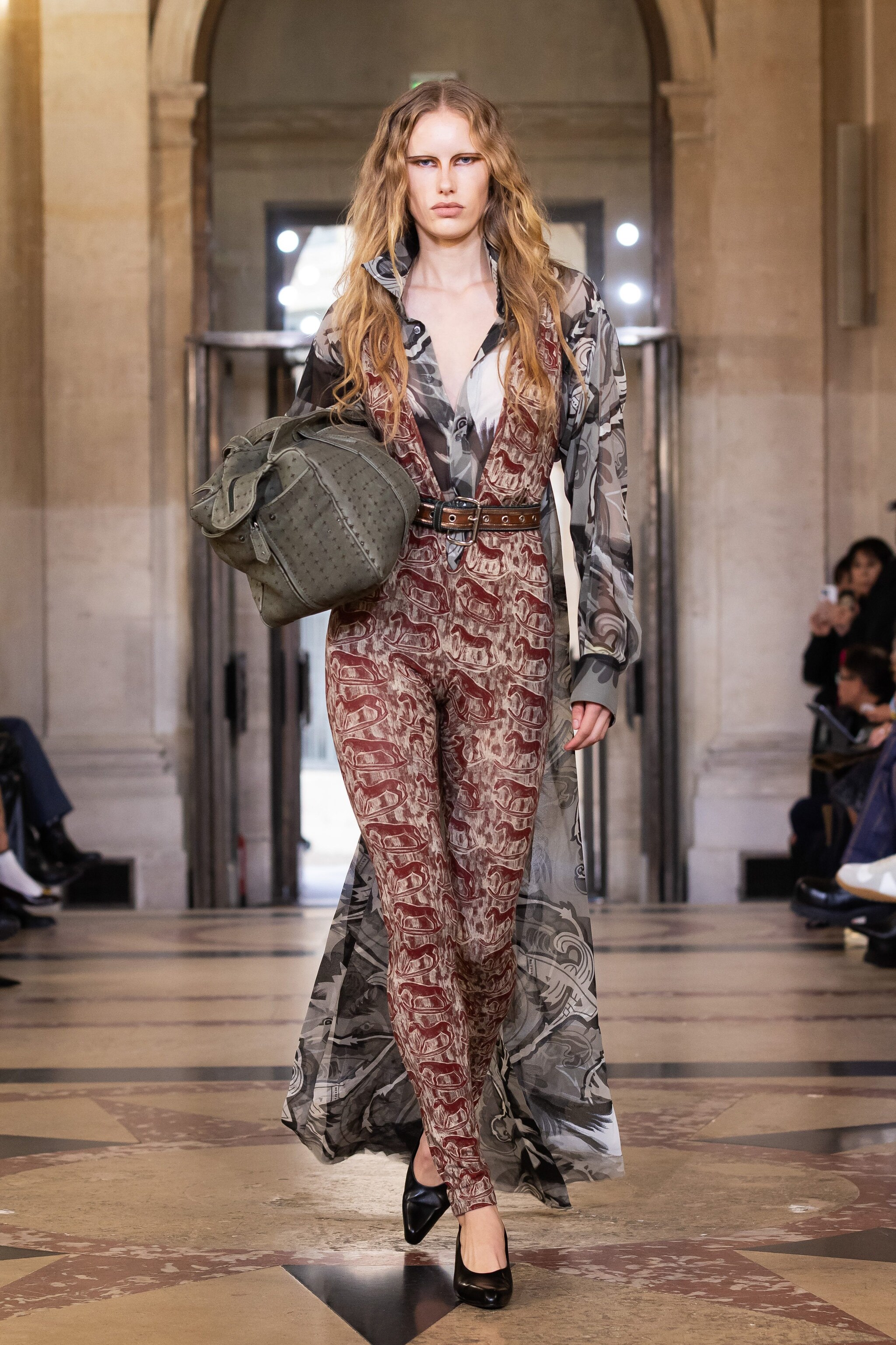 Tartan mescolato con fantasie animalier o floreali e ancora ghirigori stampati su abiti strapless, modelli asimmetrici, drappeggi e completi con blazer oversize sfilano alla Paris Fashion Week sulla passerella Primavera/Estate 2026 di Vivienne Westwood by Andreas Kronthaler