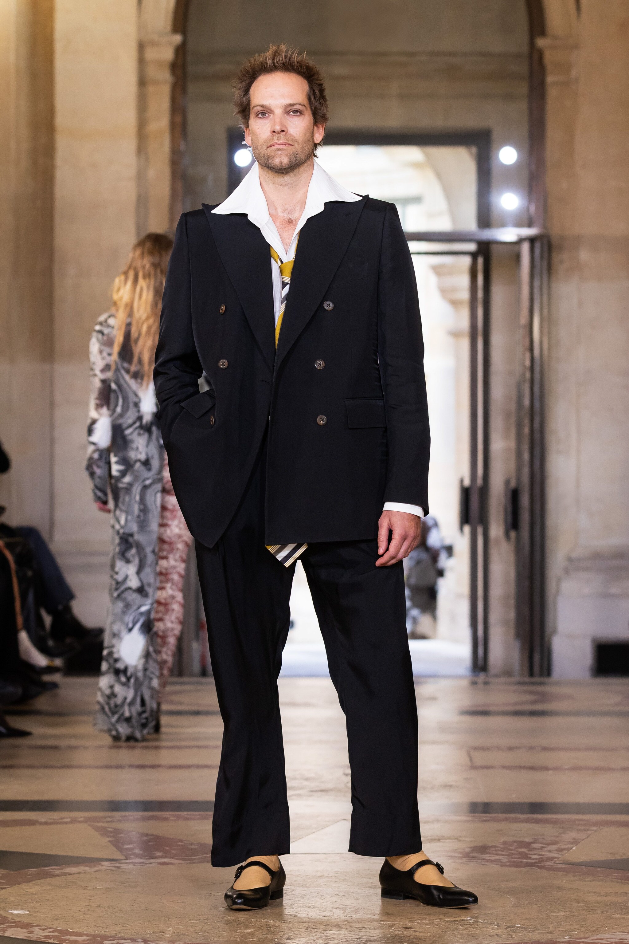 Tartan mescolato con fantasie animalier o floreali e ancora ghirigori stampati su abiti strapless, modelli asimmetrici, drappeggi e completi con blazer oversize sfilano alla Paris Fashion Week sulla passerella Primavera/Estate 2026 di Vivienne Westwood by Andreas Kronthaler