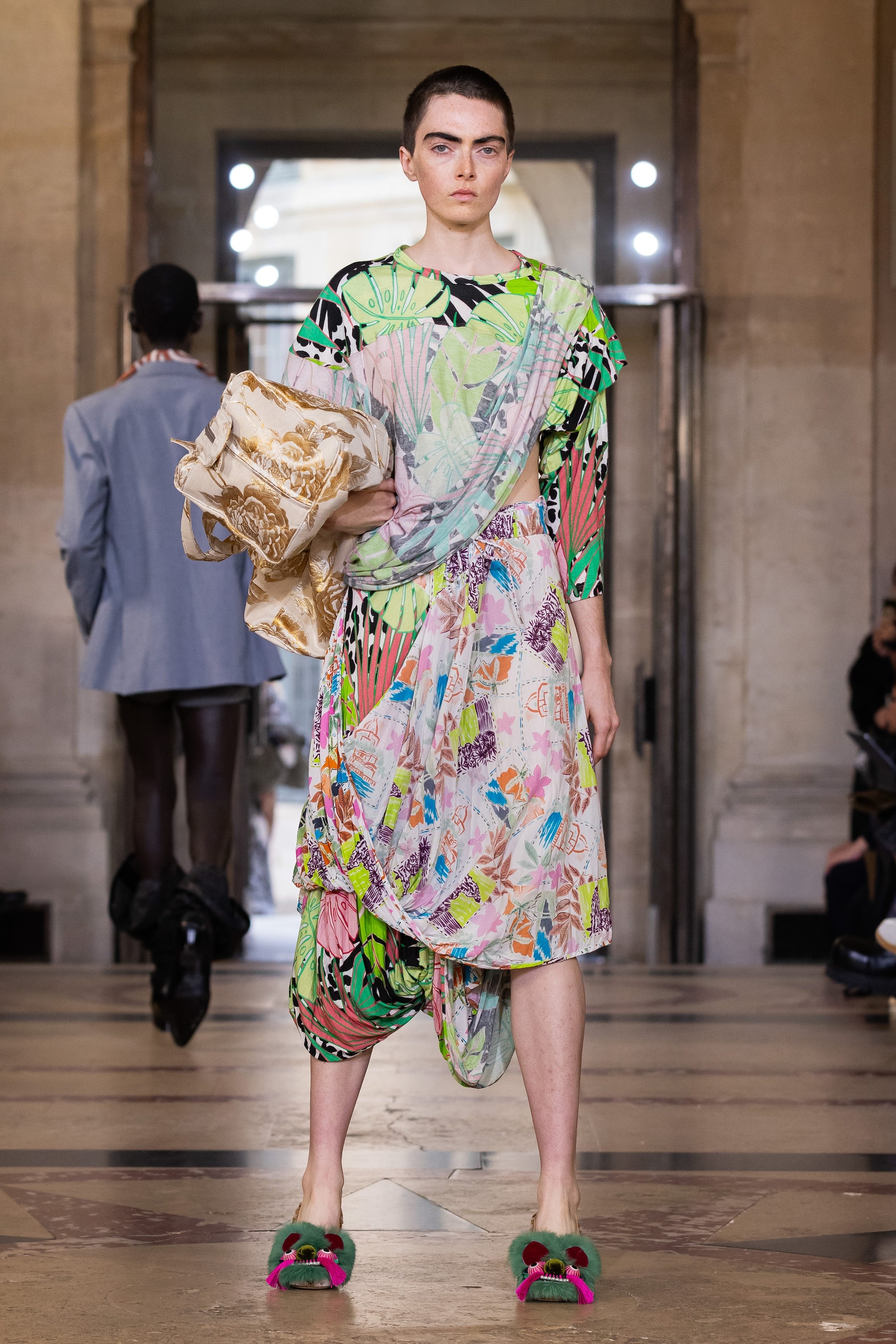 Tartan mescolato con fantasie animalier o floreali e ancora ghirigori stampati su abiti strapless, modelli asimmetrici, drappeggi e completi con blazer oversize sfilano alla Paris Fashion Week sulla passerella Primavera/Estate 2026 di Vivienne Westwood by Andreas Kronthaler