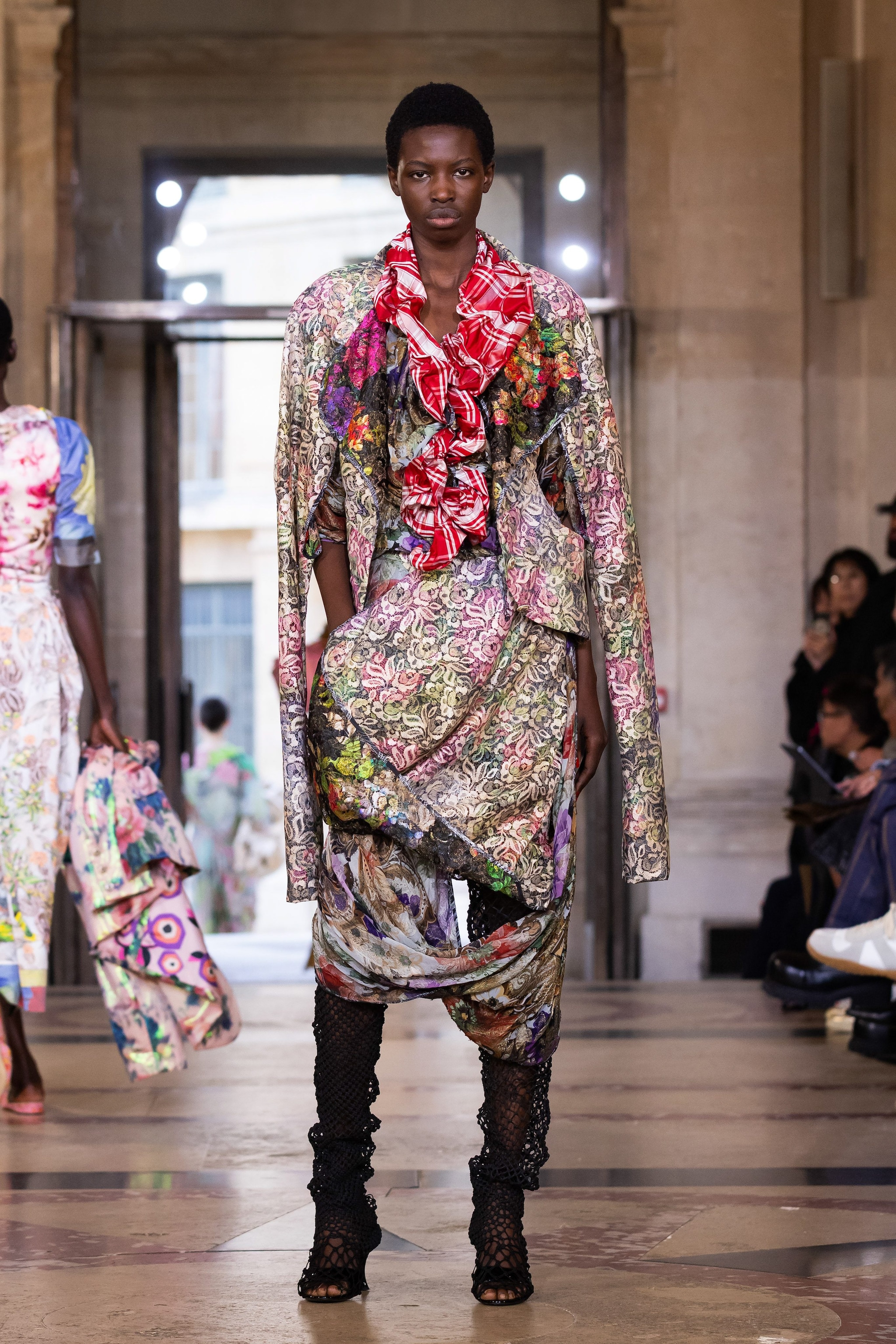 Tartan mescolato con fantasie animalier o floreali e ancora ghirigori stampati su abiti strapless, modelli asimmetrici, drappeggi e completi con blazer oversize sfilano alla Paris Fashion Week sulla passerella Primavera/Estate 2026 di Vivienne Westwood by Andreas Kronthaler