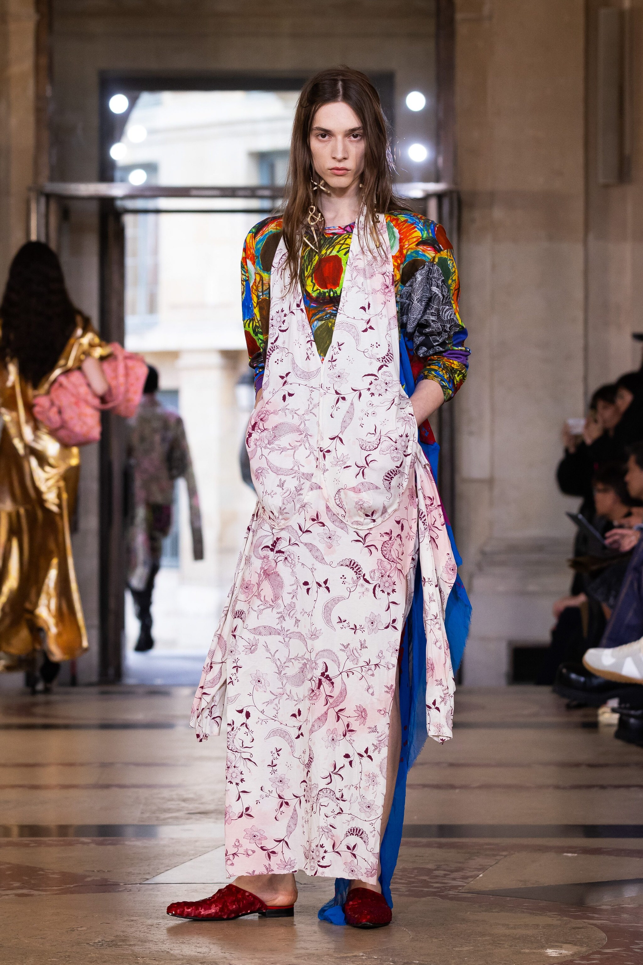 Tartan mescolato con fantasie animalier o floreali e ancora ghirigori stampati su abiti strapless, modelli asimmetrici, drappeggi e completi con blazer oversize sfilano alla Paris Fashion Week sulla passerella Primavera/Estate 2026 di Vivienne Westwood by Andreas Kronthaler