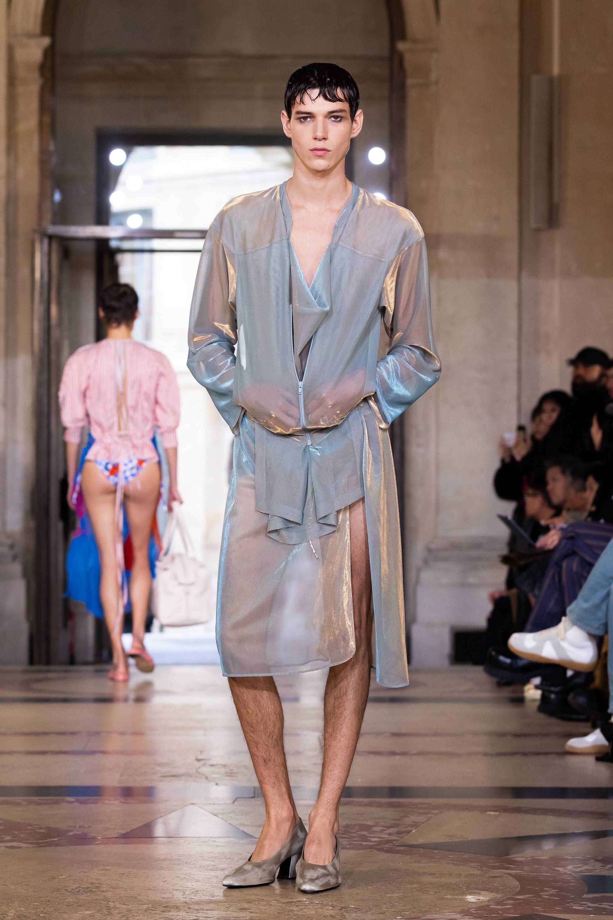 Tartan mescolato con fantasie animalier o floreali e ancora ghirigori stampati su abiti strapless, modelli asimmetrici, drappeggi e completi con blazer oversize sfilano alla Paris Fashion Week sulla passerella Primavera/Estate 2026 di Vivienne Westwood by Andreas Kronthaler