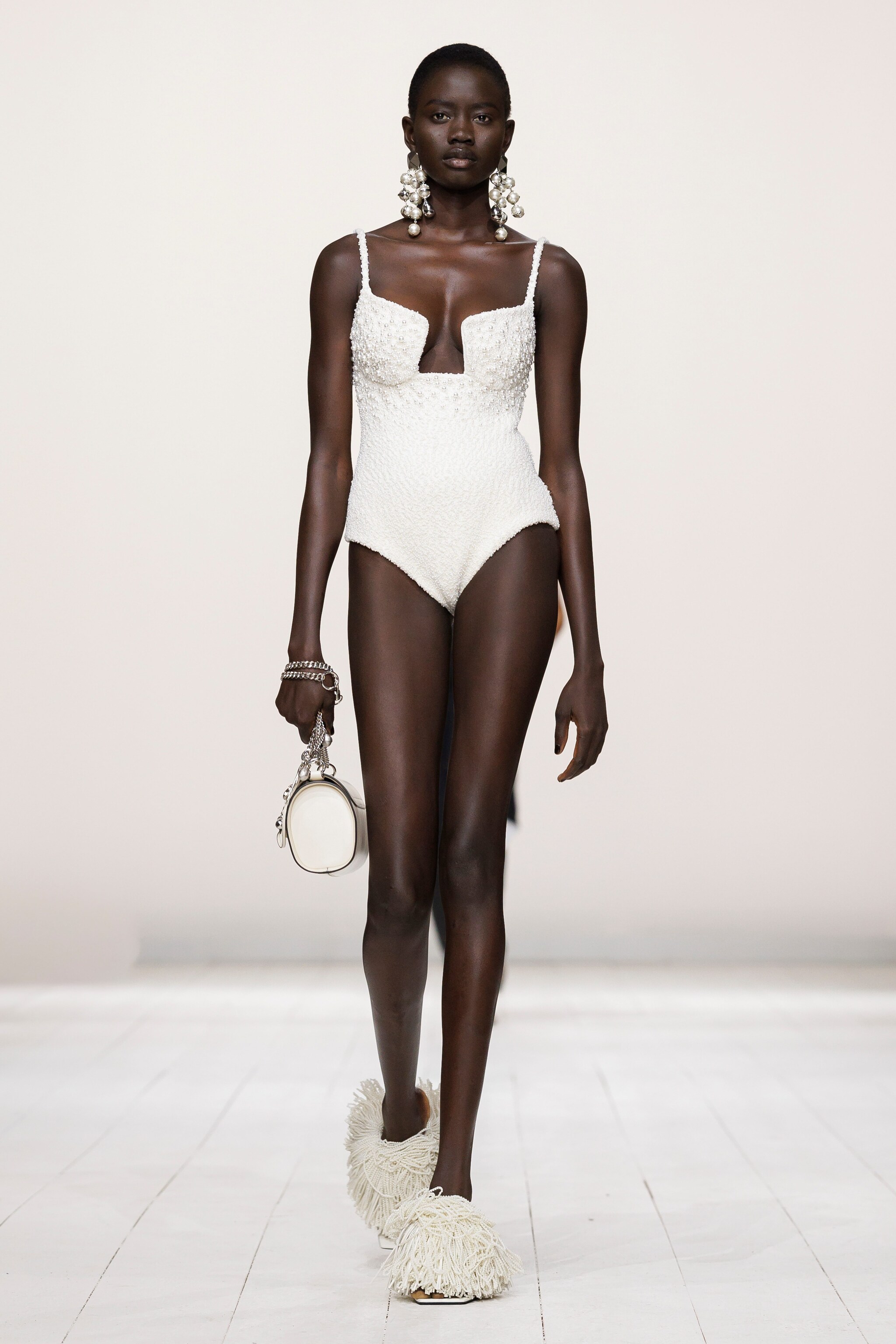 Top reggiseno, jeans a palazzo, camicie oversize, abiti in pelle, drappeggi e tocchi di rosso tra look in black and white sfilano alla Paris Fashion Week sulla passerella Primavera/Estate 2026 di Givenchy by Sarah Burton