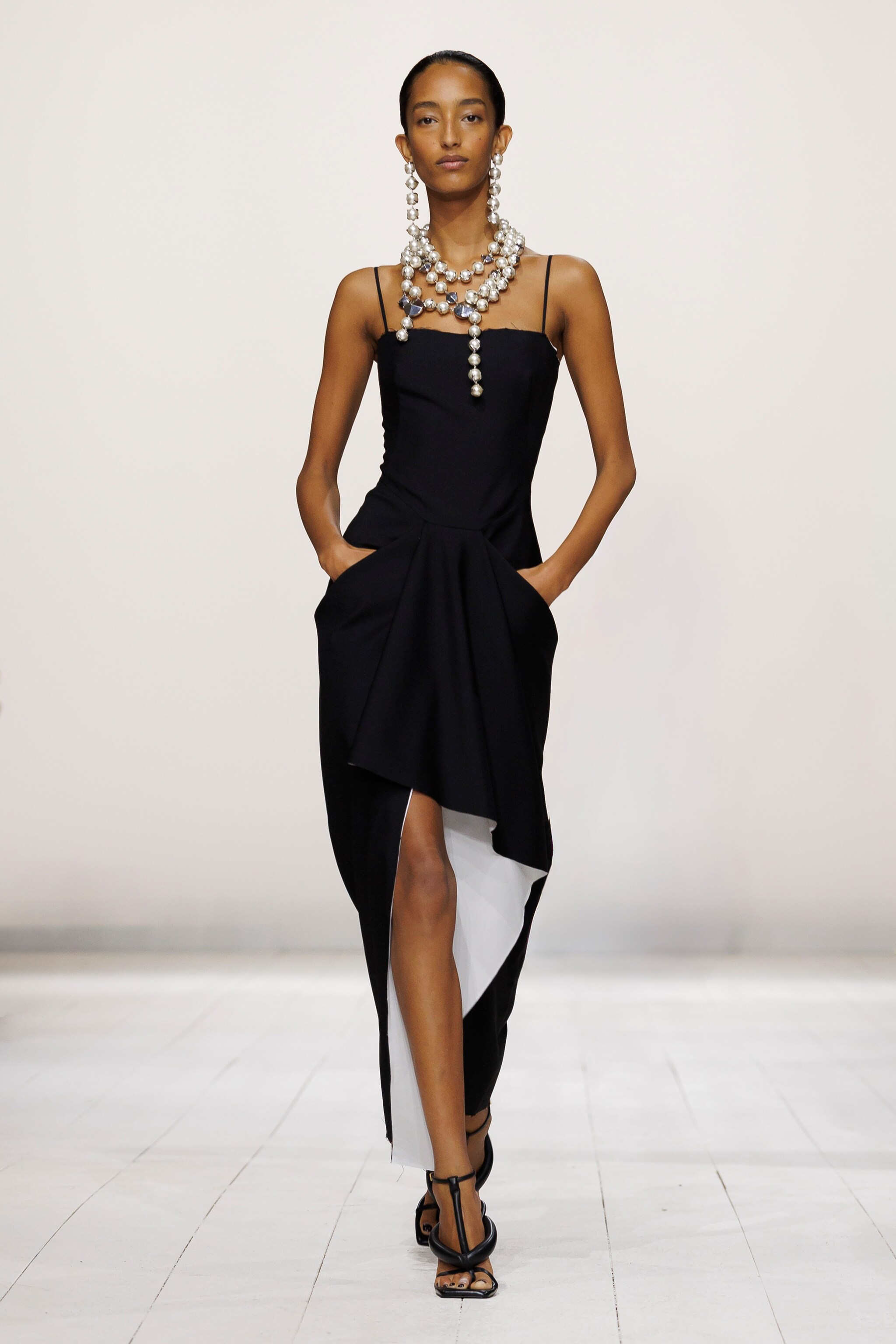 Top reggiseno, jeans a palazzo, camicie oversize, abiti in pelle, drappeggi e tocchi di rosso tra look in black and white sfilano alla Paris Fashion Week sulla passerella Primavera/Estate 2026 di Givenchy by Sarah Burton