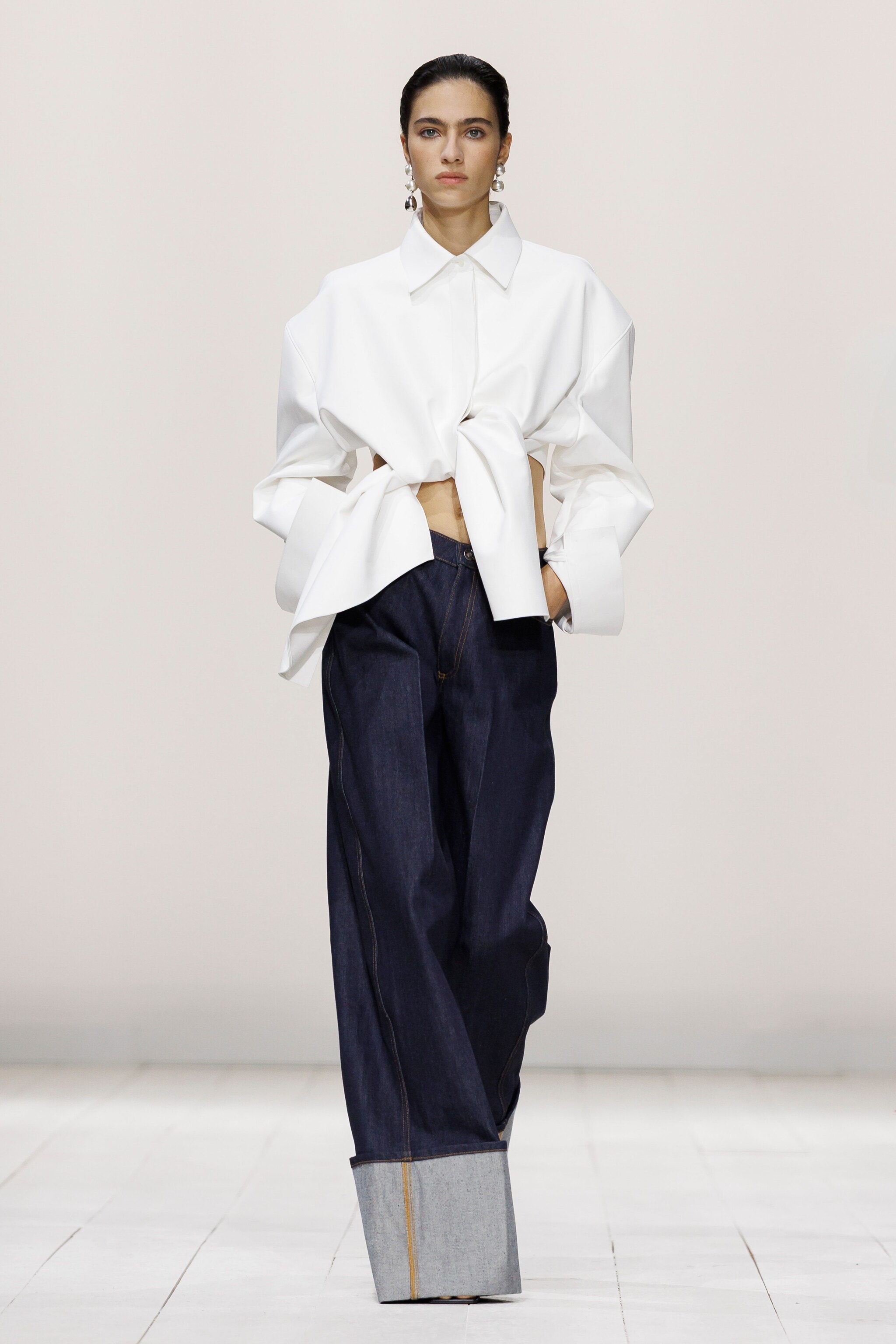 Top reggiseno, jeans a palazzo, camicie oversize, abiti in pelle, drappeggi e tocchi di rosso tra look in black and white sfilano alla Paris Fashion Week sulla passerella Primavera/Estate 2026 di Givenchy by Sarah Burton