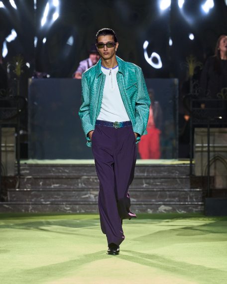 Completi sartoriali che sembrano tute gym, colori fluo mescolati con fantasie animalier, nero e celeste, sfilano alla Paris Fashion Week sulla passerella Primavera/Estate 2026 di Casablanca