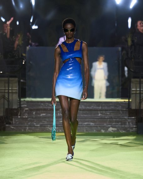 Completi sartoriali che sembrano tute gym, colori fluo mescolati con fantasie animalier, nero e celeste, sfilano alla Paris Fashion Week sulla passerella Primavera/Estate 2026 di Casablanca