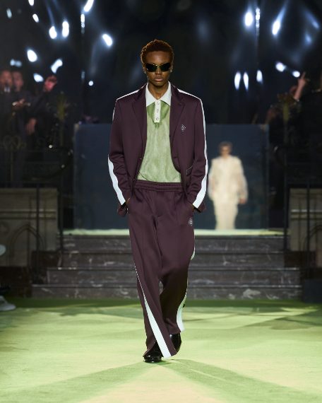 Completi sartoriali che sembrano tute gym, colori fluo mescolati con fantasie animalier, nero e celeste, sfilano alla Paris Fashion Week sulla passerella Primavera/Estate 2026 di Casablanca