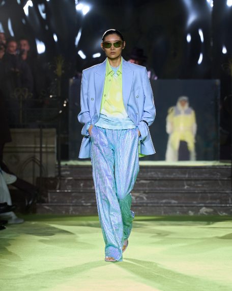 Completi sartoriali che sembrano tute gym, colori fluo mescolati con fantasie animalier, nero e celeste, sfilano alla Paris Fashion Week sulla passerella Primavera/Estate 2026 di Casablanca