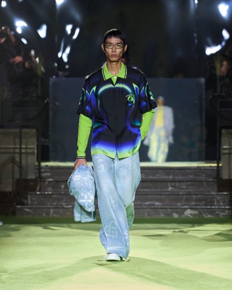 Completi sartoriali che sembrano tute gym, colori fluo mescolati con fantasie animalier, nero e celeste, sfilano alla Paris Fashion Week sulla passerella Primavera/Estate 2026 di Casablanca