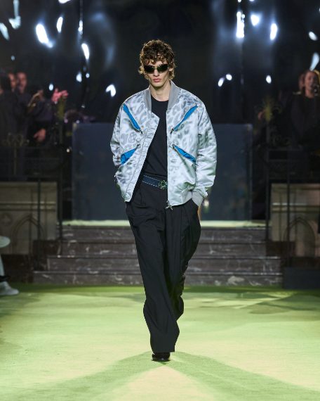 Completi sartoriali che sembrano tute gym, colori fluo mescolati con fantasie animalier, nero e celeste, sfilano alla Paris Fashion Week sulla passerella Primavera/Estate 2026 di Casablanca