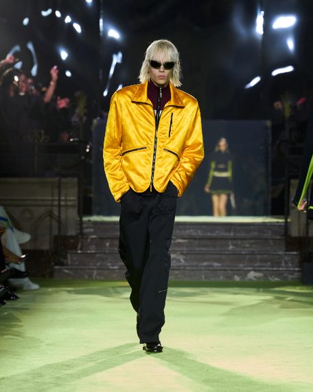 Completi sartoriali che sembrano tute gym, colori fluo mescolati con fantasie animalier, nero e celeste, sfilano alla Paris Fashion Week sulla passerella Primavera/Estate 2026 di Casablanca