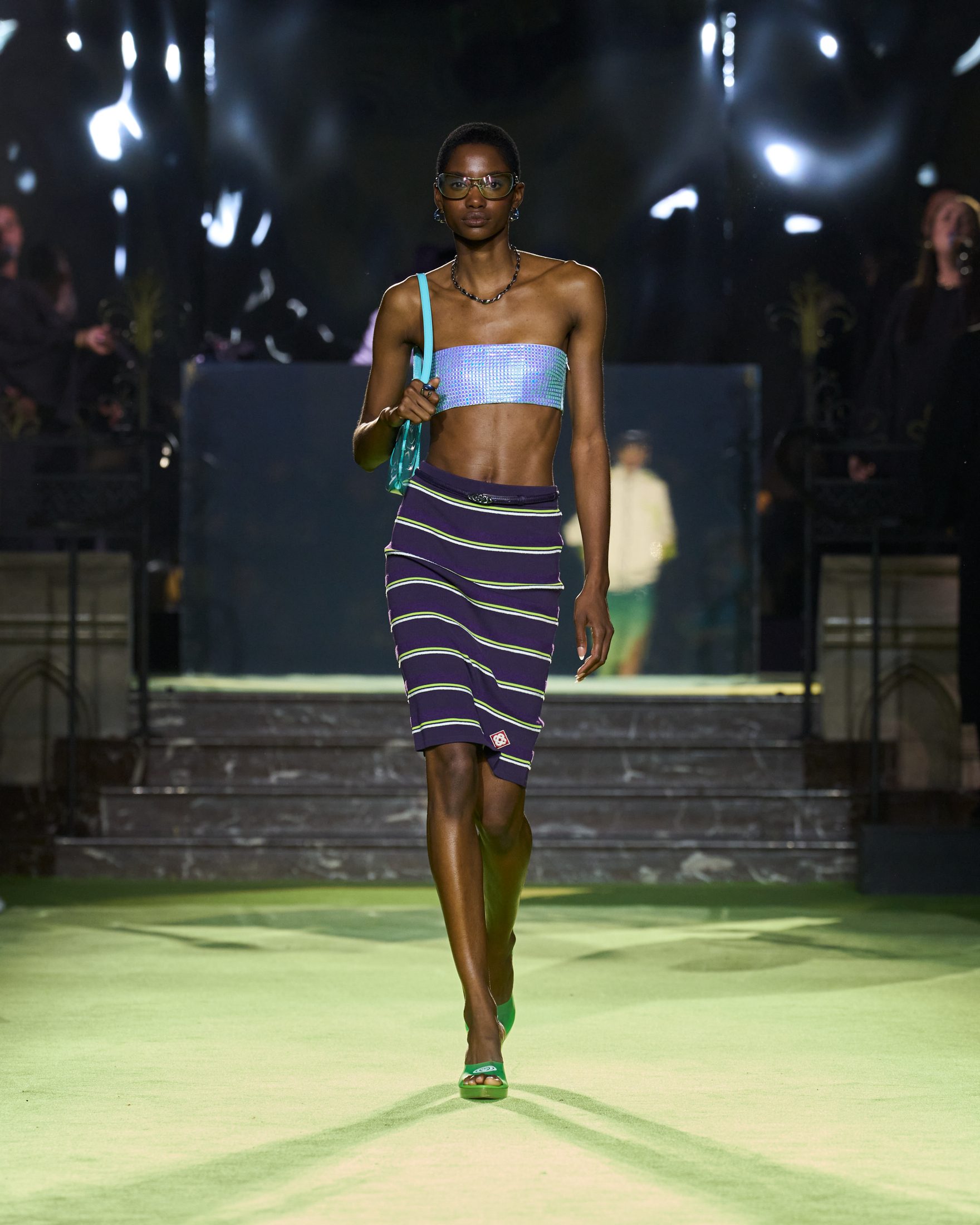 Completi sartoriali che sembrano tute gym, colori fluo mescolati con fantasie animalier, nero e celeste, sfilano alla Paris Fashion Week sulla passerella Primavera/Estate 2026 di Casablanca