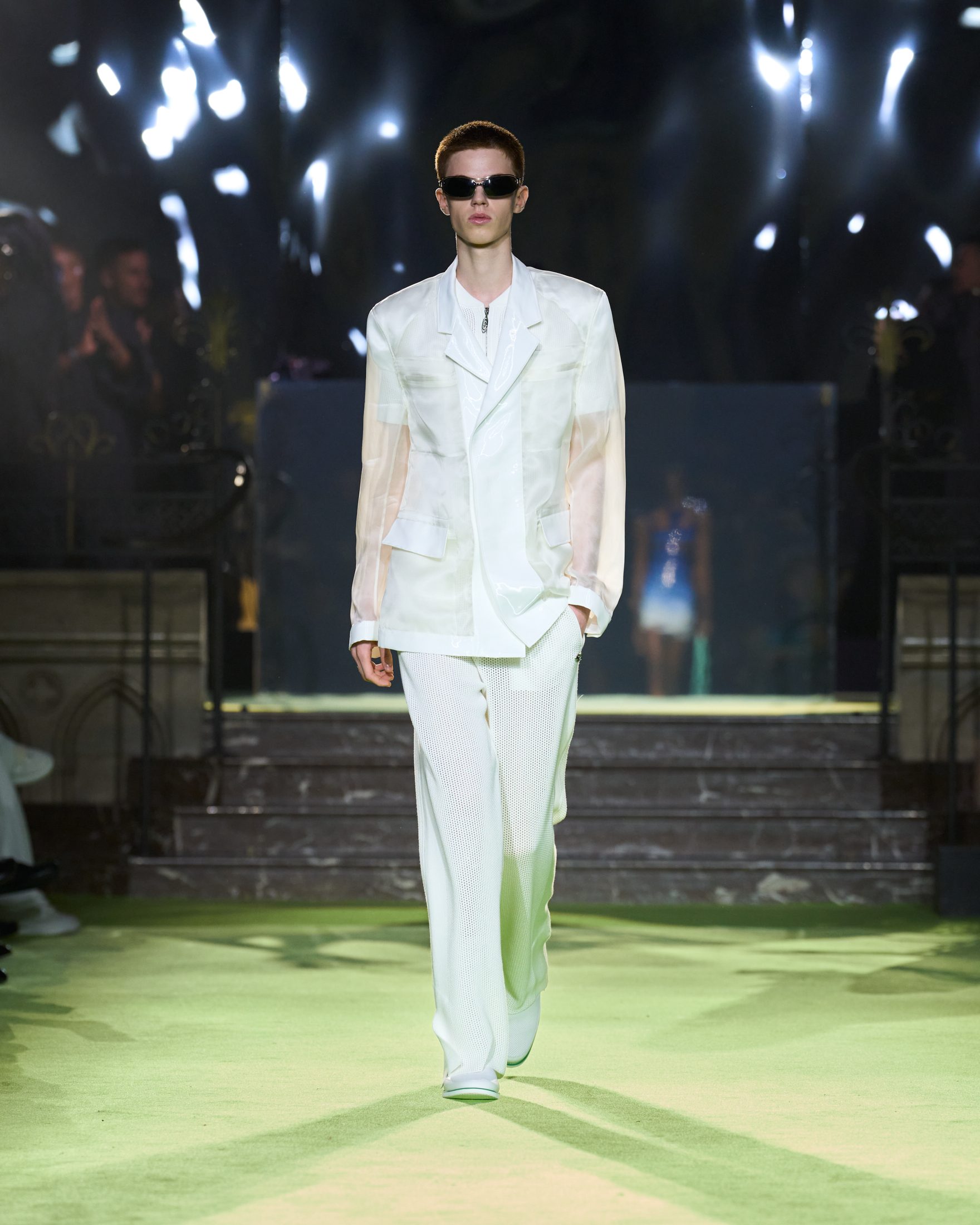 Completi sartoriali che sembrano tute gym, colori fluo mescolati con fantasie animalier, nero e celeste, sfilano alla Paris Fashion Week sulla passerella Primavera/Estate 2026 di Casablanca