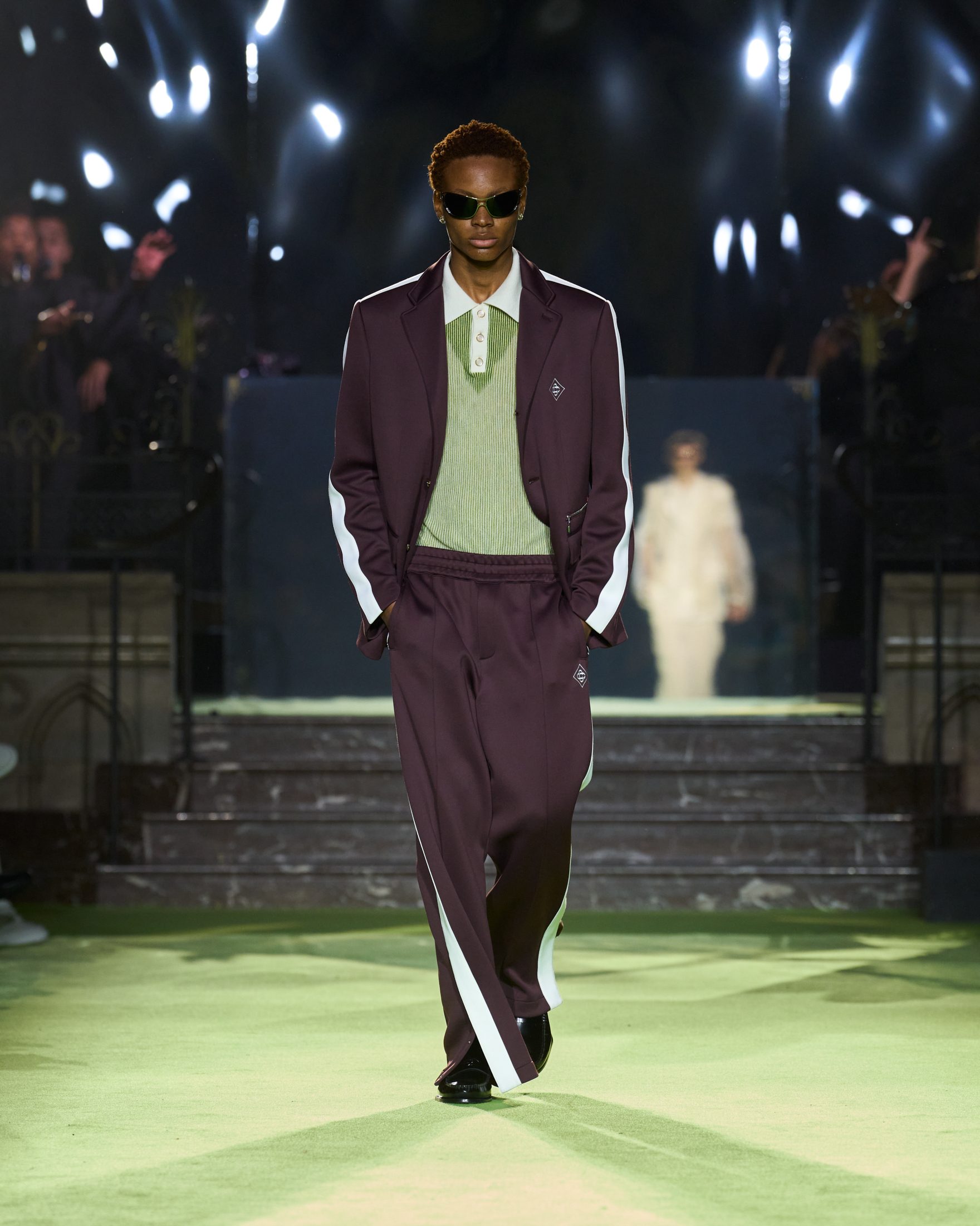 Completi sartoriali che sembrano tute gym, colori fluo mescolati con fantasie animalier, nero e celeste, sfilano alla Paris Fashion Week sulla passerella Primavera/Estate 2026 di Casablanca