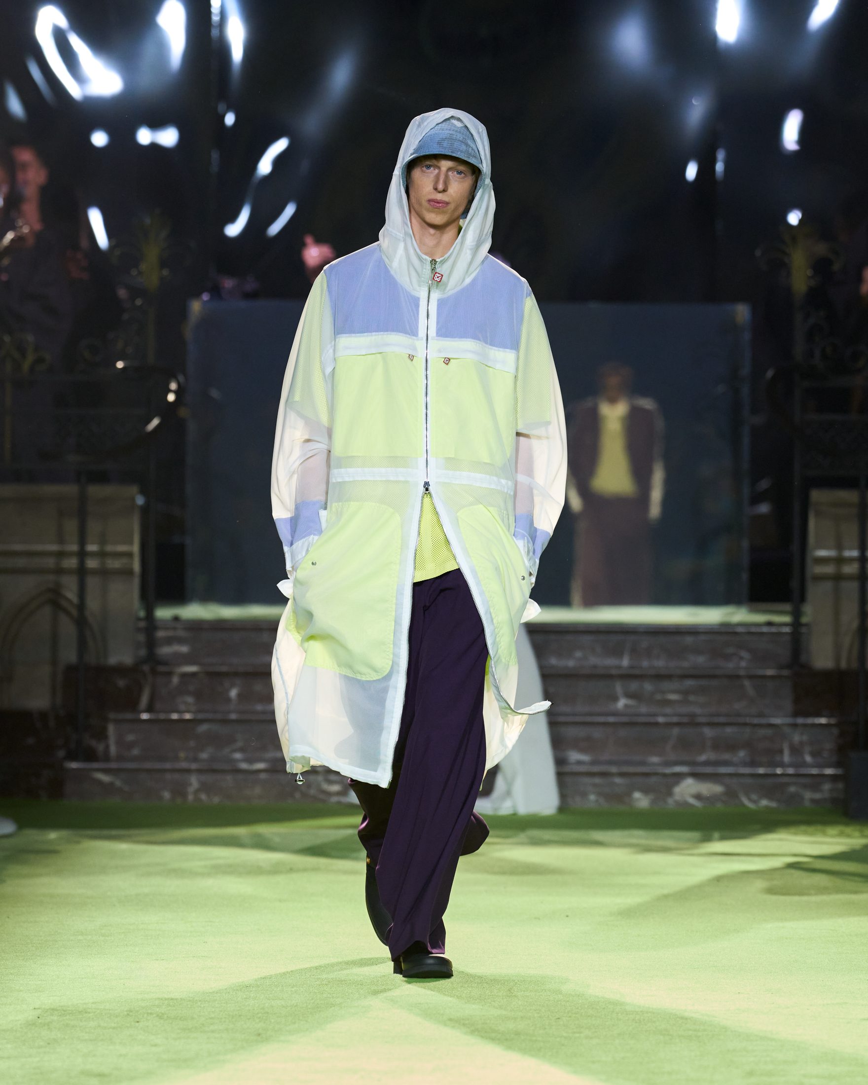 Completi sartoriali che sembrano tute gym, colori fluo mescolati con fantasie animalier, nero e celeste, sfilano alla Paris Fashion Week sulla passerella Primavera/Estate 2026 di Casablanca