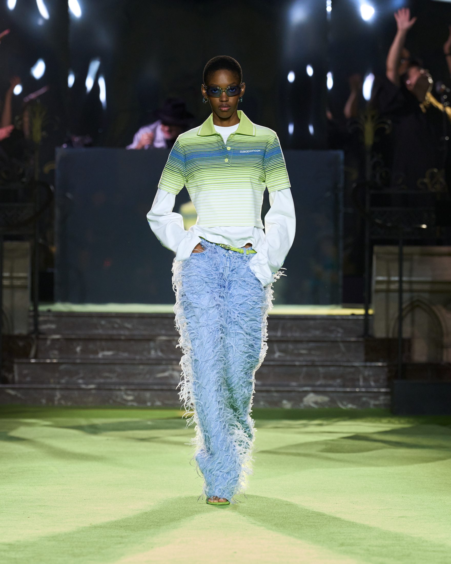 Completi sartoriali che sembrano tute gym, colori fluo mescolati con fantasie animalier, nero e celeste, sfilano alla Paris Fashion Week sulla passerella Primavera/Estate 2026 di Casablanca