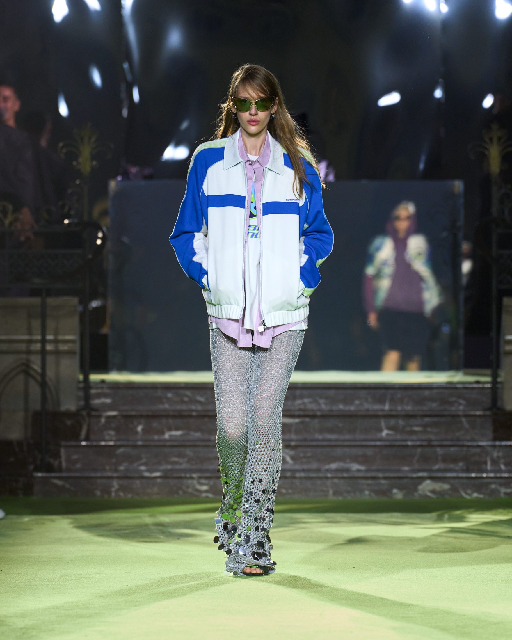 Completi sartoriali che sembrano tute gym, colori fluo mescolati con fantasie animalier, nero e celeste, sfilano alla Paris Fashion Week sulla passerella Primavera/Estate 2026 di Casablanca