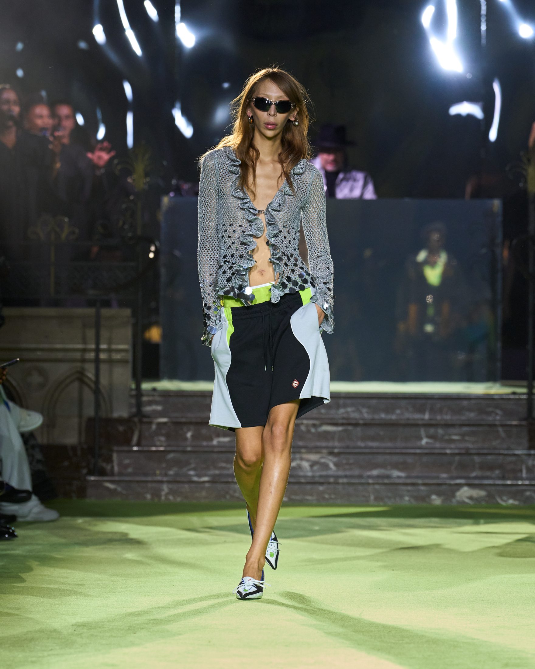 Completi sartoriali che sembrano tute gym, colori fluo mescolati con fantasie animalier, nero e celeste, sfilano alla Paris Fashion Week sulla passerella Primavera/Estate 2026 di Casablanca