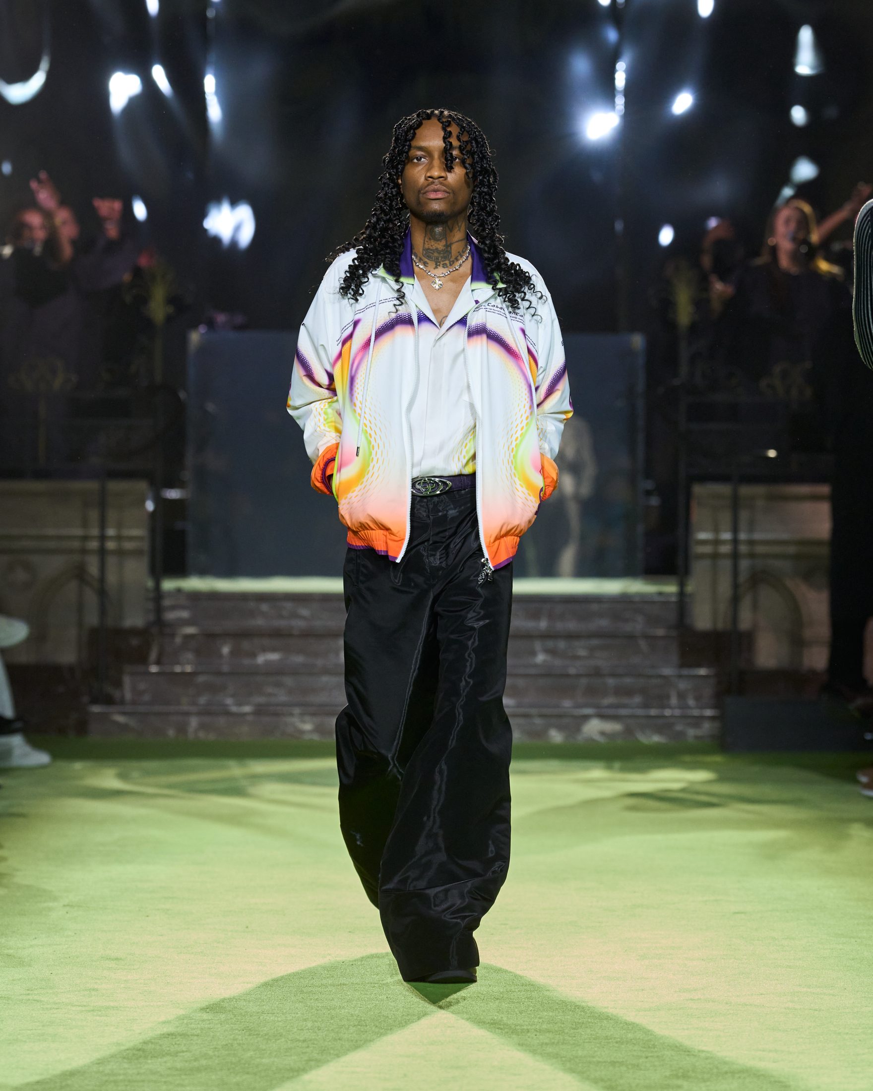 Completi sartoriali che sembrano tute gym, colori fluo mescolati con fantasie animalier, nero e celeste, sfilano alla Paris Fashion Week sulla passerella Primavera/Estate 2026 di Casablanca