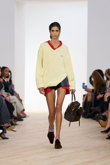 Abiti strutturati, fantasie floreali o rigate, gonne asimmetriche e giacche tecniche sfilano alla Paris Fashion Week sulla passerella Primavera/Estate 2026 di Loewe