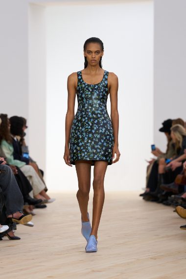 Abiti strutturati, fantasie floreali o rigate, gonne asimmetriche e giacche tecniche sfilano alla Paris Fashion Week sulla passerella Primavera/Estate 2026 di Loewe