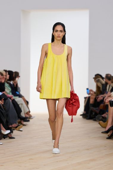 Abiti strutturati, fantasie floreali o rigate, gonne asimmetriche e giacche tecniche sfilano alla Paris Fashion Week sulla passerella Primavera/Estate 2026 di Loewe