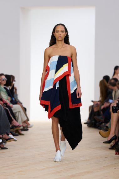 Abiti strutturati, fantasie floreali o rigate, gonne asimmetriche e giacche tecniche sfilano alla Paris Fashion Week sulla passerella Primavera/Estate 2026 di Loewe