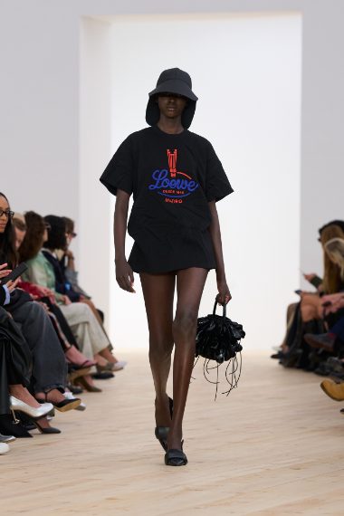Abiti strutturati, fantasie floreali o rigate, gonne asimmetriche e giacche tecniche sfilano alla Paris Fashion Week sulla passerella Primavera/Estate 2026 di Loewe