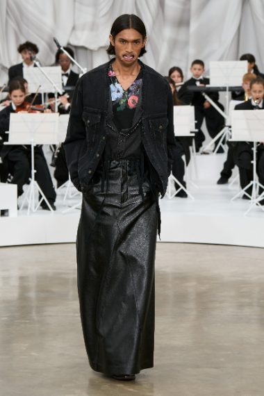 Lunghi abiti in pelle nera e trench in denim, trench oversize abiti florali dai dettagli drappeggiati sfilano alla Paris Fashion Week sulla passerella Primavera/Estate 2026 di Maison Margiela