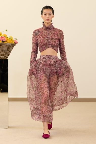 Fantasie floreali, gonne balloon e abiti con ruche e volant sfilano alla Paris Fashion Week sulla passerella Primavera/Estate 2026 di Giambattista Valli