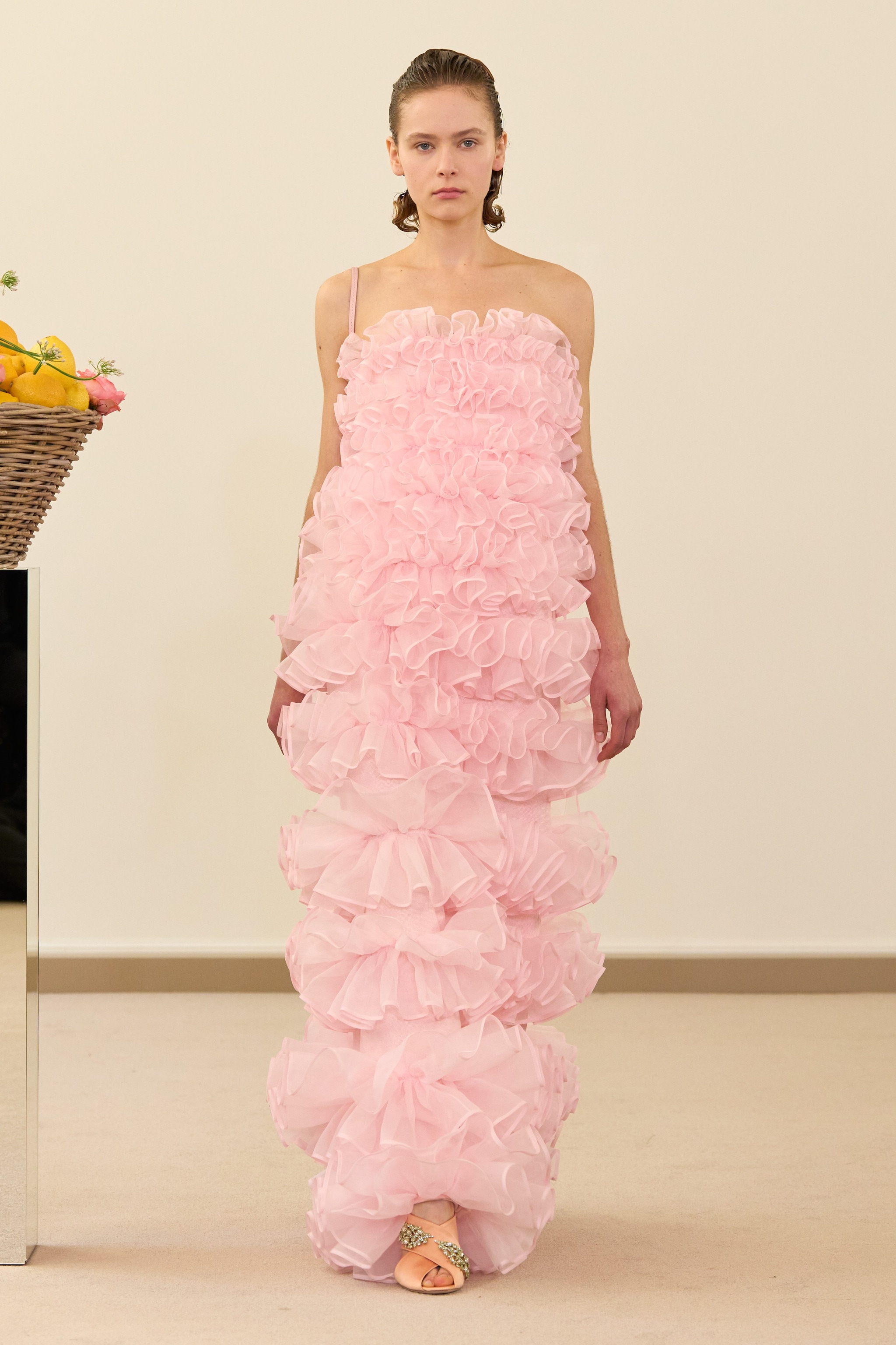 Fantasie floreali, gonne balloon e abiti con ruche e volant sfilano alla Paris Fashion Week sulla passerella Primavera/Estate 2026 di Giambattista Valli