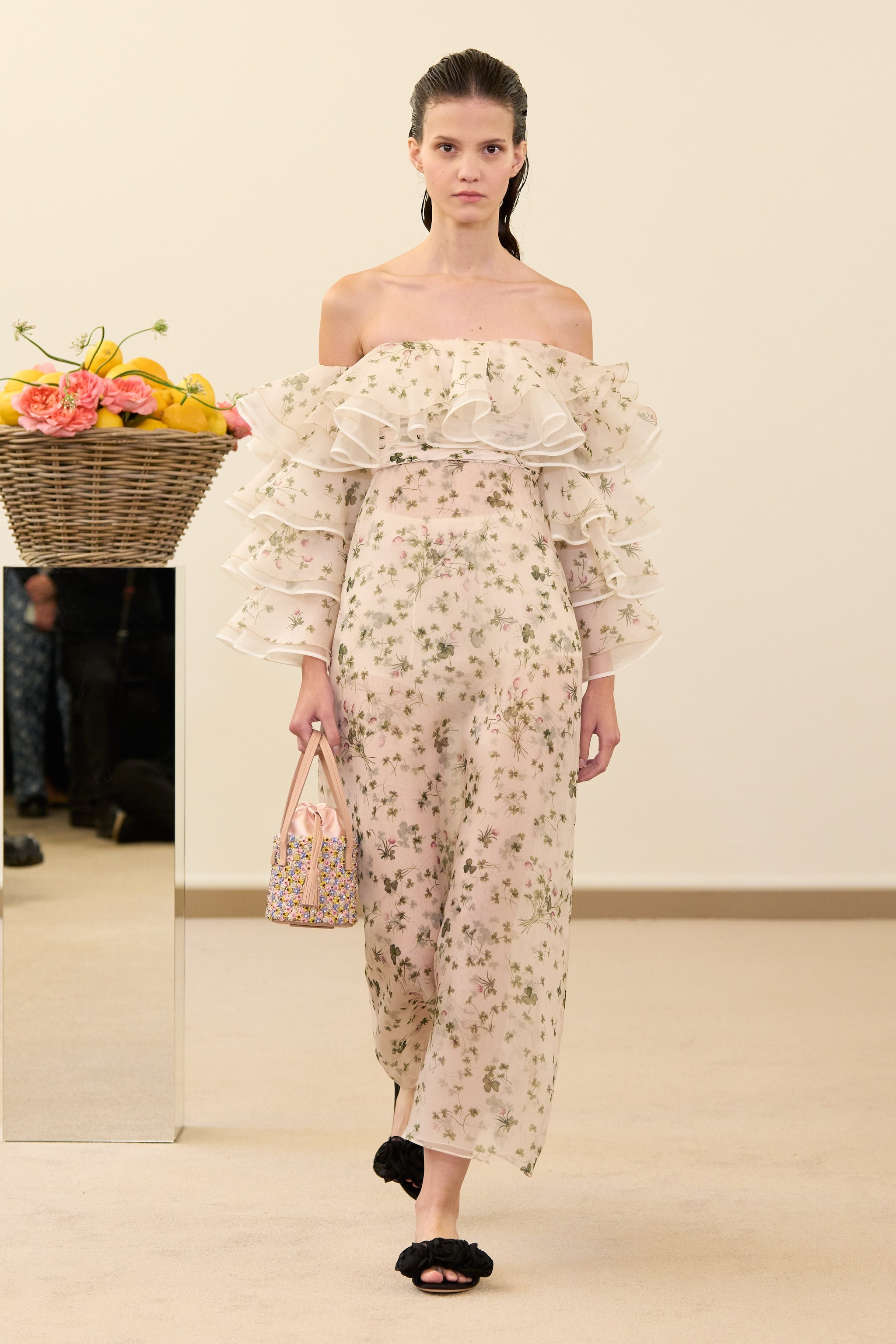 Fantasie floreali, gonne balloon e abiti con ruche e volant sfilano alla Paris Fashion Week sulla passerella Primavera/Estate 2026 di Giambattista Valli