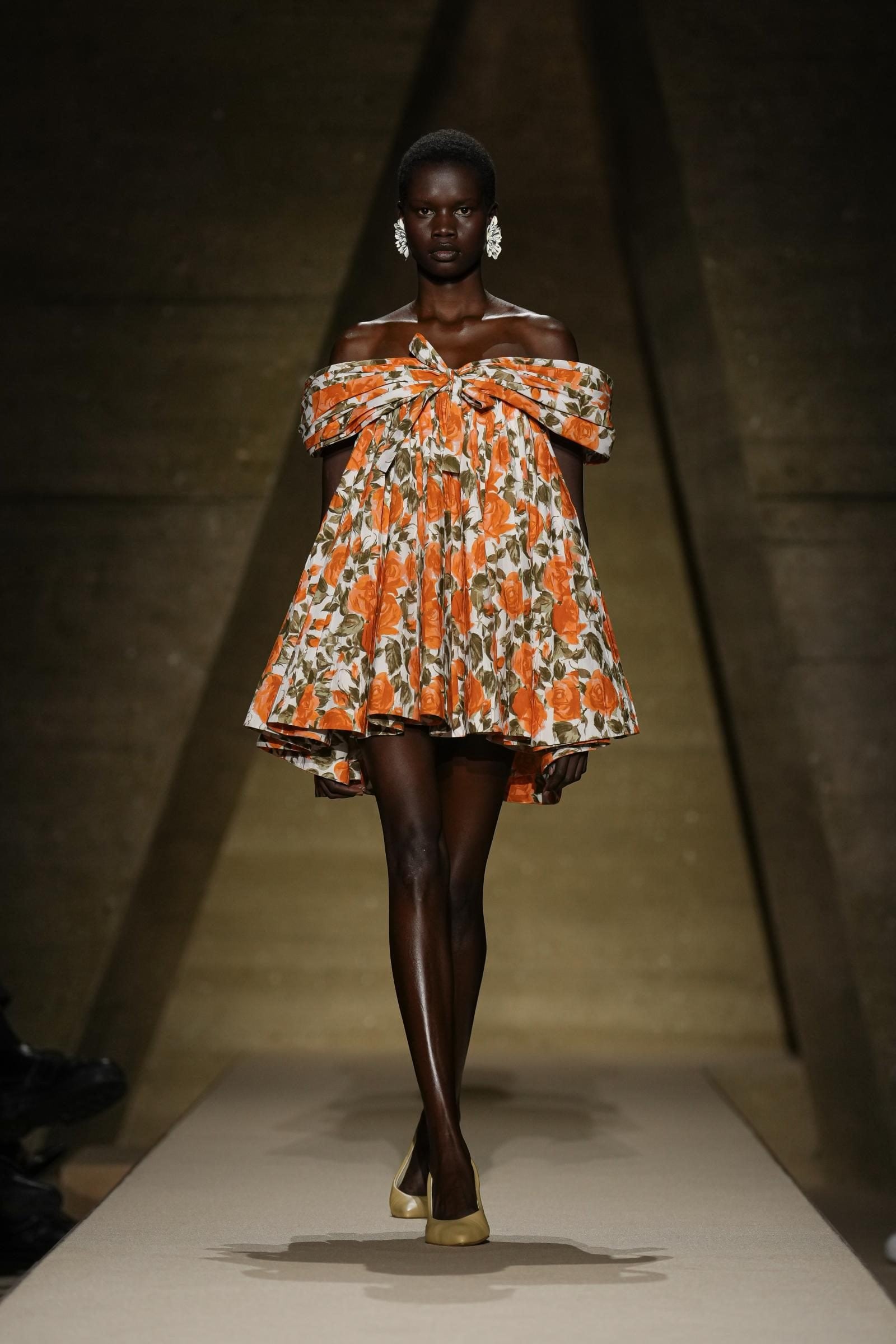 Abiti a fiori, completi con ruche in satin e giacche tecniche trasformate con l'aggiunta di dettagli romantic sfilano alla Paris Fashion Week sulla passerella Primavera/Estate 2026 di Chloé