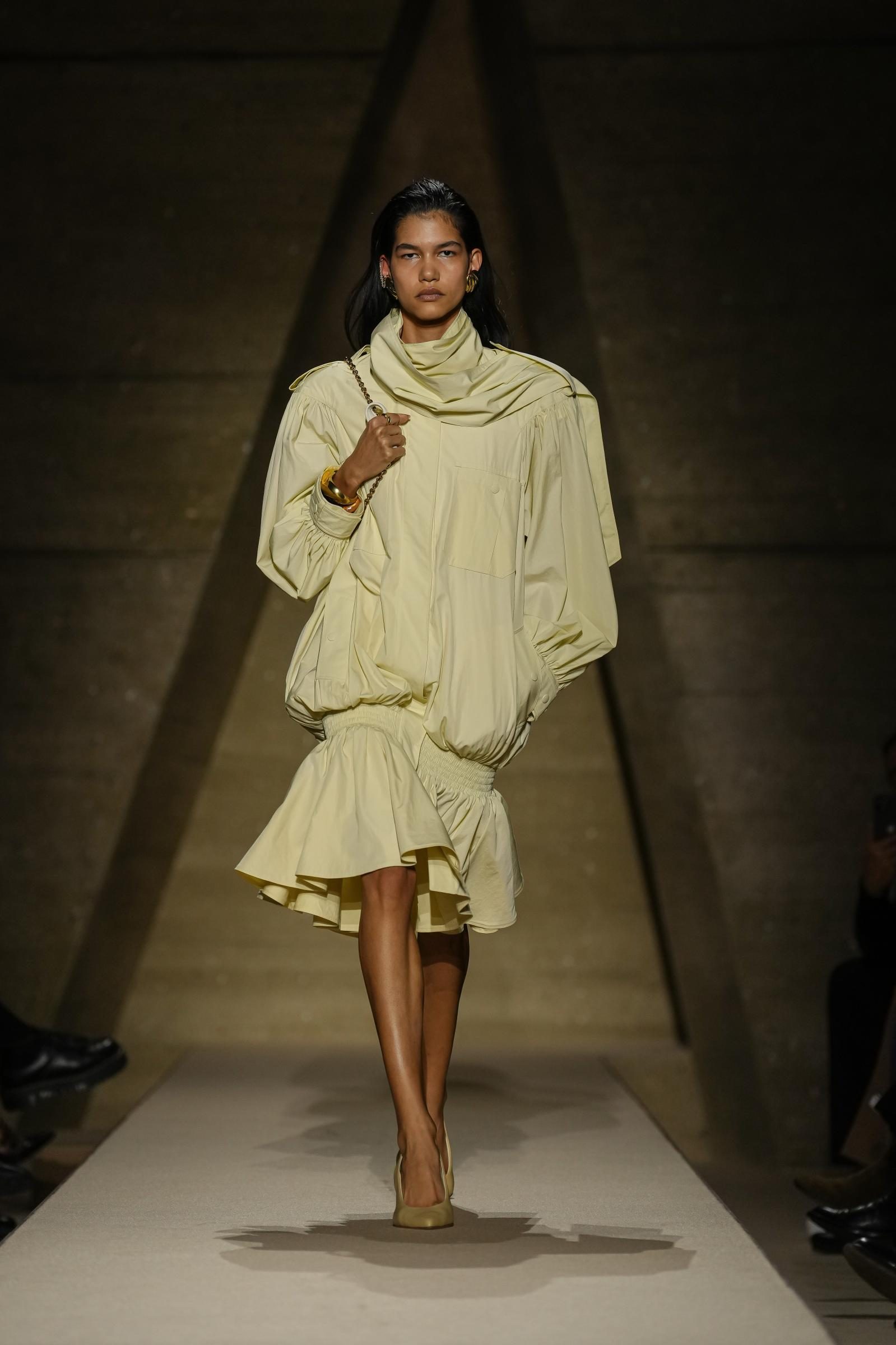 Abiti a fiori, completi con ruche in satin e giacche tecniche trasformate con l'aggiunta di dettagli romantic sfilano alla Paris Fashion Week sulla passerella Primavera/Estate 2026 di Chloé