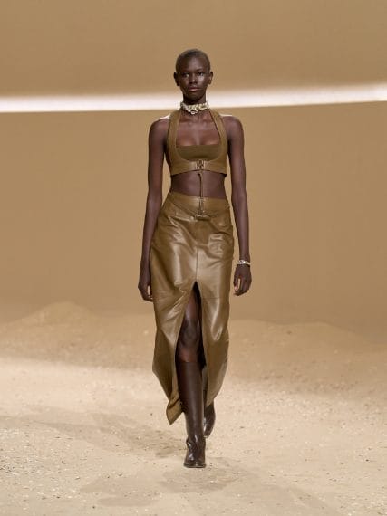 Gonne longuette dal taglio asimmetrico, trench e capospalla dalla lavorazione matelassé, mini gilet e top con cinghie sfilano alla Paris Fashion Week sulla passerella Primavera/Estate 2026 di Hermes