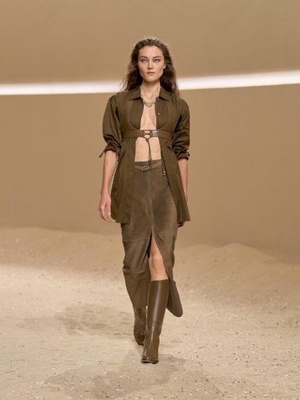 Gonne longuette dal taglio asimmetrico, trench e capospalla dalla lavorazione matelassé, mini gilet e top con cinghie sfilano alla Paris Fashion Week sulla passerella Primavera/Estate 2026 di Hermes