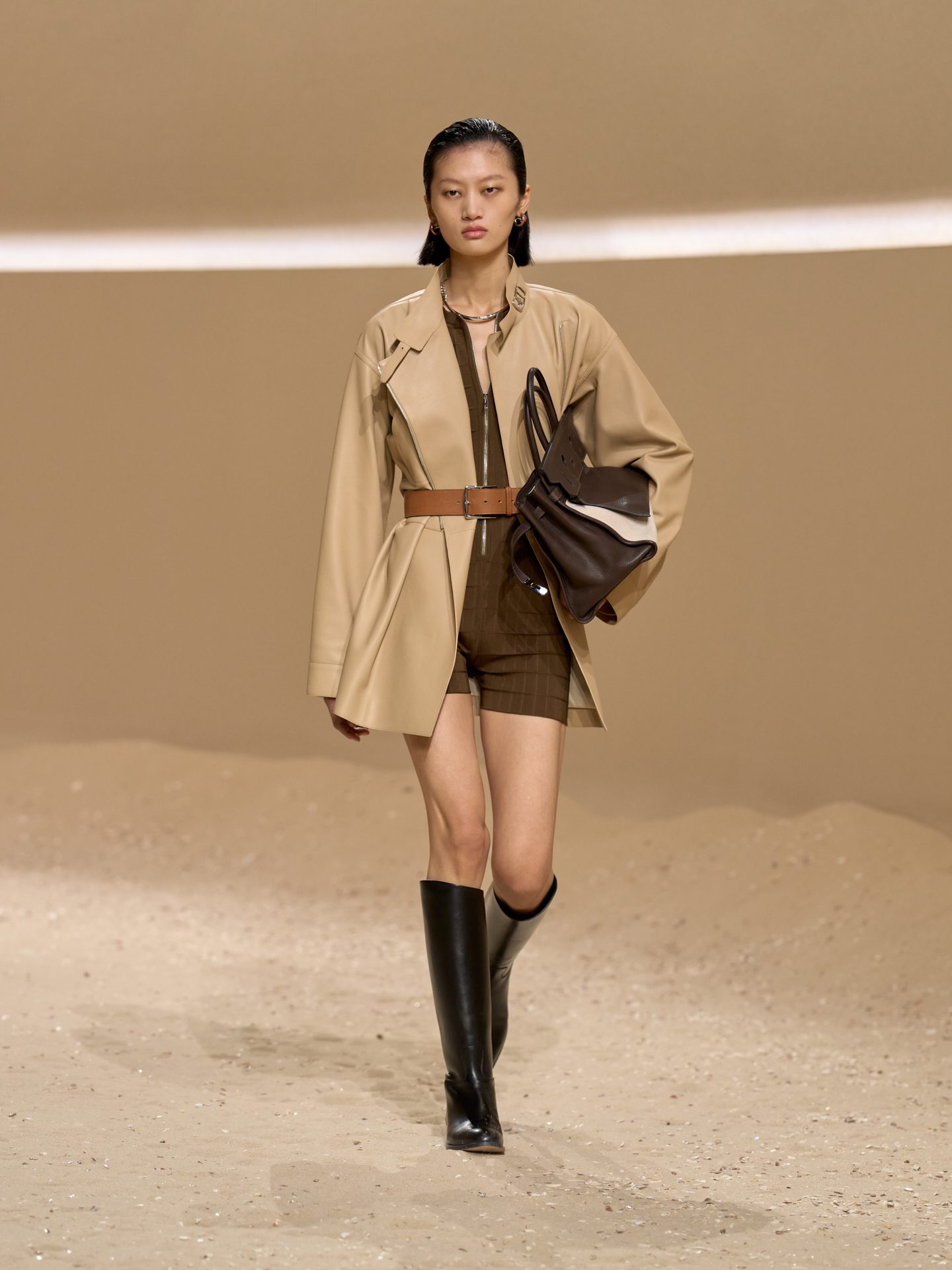 Gonne longuette dal taglio asimmetrico, trench e capospalla dalla lavorazione matelassé, mini gilet e top con cinghie sfilano alla Paris Fashion Week sulla passerella Primavera/Estate 2026 di Hermes