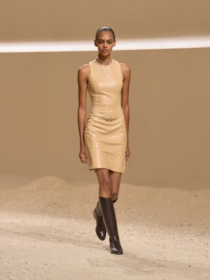 Gonne longuette dal taglio asimmetrico, trench e capospalla dalla lavorazione matelassé, mini gilet e top con cinghie sfilano alla Paris Fashion Week sulla passerella Primavera/Estate 2026 di Hermes