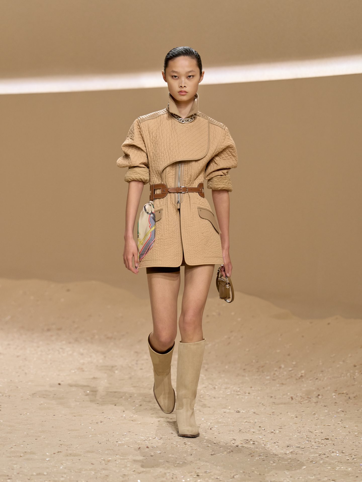 Gonne longuette dal taglio asimmetrico, trench e capospalla dalla lavorazione matelassé, mini gilet e top con cinghie sfilano alla Paris Fashion Week sulla passerella Primavera/Estate 2026 di Hermes