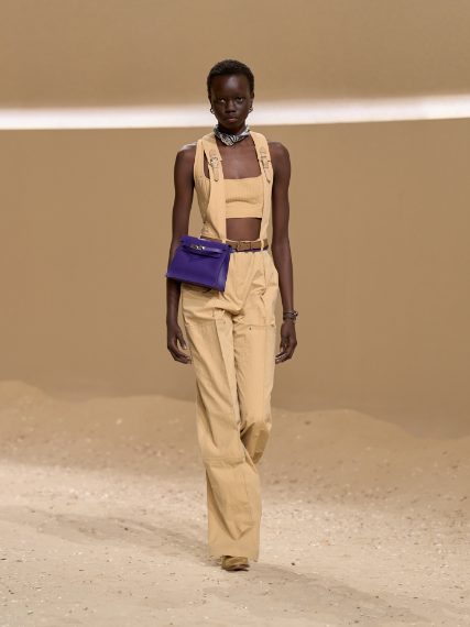 Gonne longuette dal taglio asimmetrico, trench e capospalla dalla lavorazione matelassé, mini gilet e top con cinghie sfilano alla Paris Fashion Week sulla passerella Primavera/Estate 2026 di Hermes