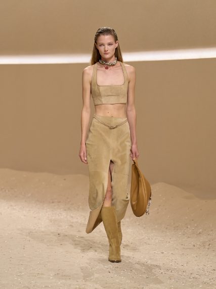 Gonne longuette dal taglio asimmetrico, trench e capospalla dalla lavorazione matelassé, mini gilet e top con cinghie sfilano alla Paris Fashion Week sulla passerella Primavera/Estate 2026 di Hermes